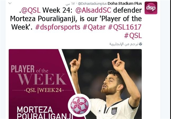مدافع ملی‌پوش کشورمان از سوی سایت Doha Stadium Plus به عنوان بهترین بازیکن هفته لیگ قطر انتخاب شد.