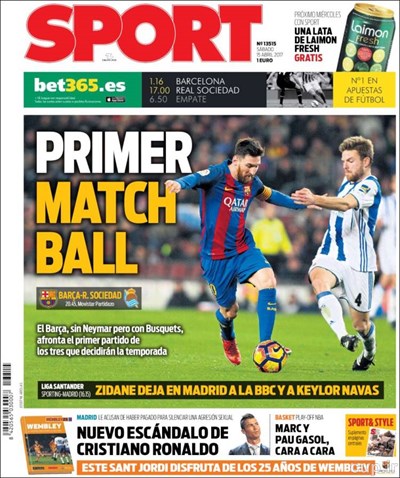روزنامه«ال‌موندو دپورتیوو» در  مورد بازی امشب بارسلونا مقابل رئال سوسیه‌داد در لالیگا  تیتر « همه فینال‌ها» را انتخاب کرد تا به این موضوع اشاره کند که تیم در هریک از بازی‌های باقی مانده فصل یک فینال واقعی پیش‌رو دارد. در آستانه بازی این هفته بارسلونا مقابل یوونتوس در دور برگشت مرحله یک‌چهارم‌نهایی لیگ قهرمانان اروپا به تمدید قرارداد پائولو دیبالا، ستاره آرژانتینی یوونتوس با تیم تورینی پرداخته شده است.