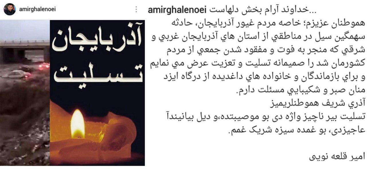 به گزارش جی پلاس، امیر قلعه نویی با ارسال پیامی در اینستاگرام خود درگذشت آذربایجانی ها در اثر سیل را تسلیت گفت.