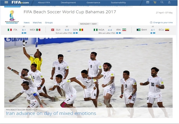 فوتبال ساحلی ایران بامداد امروز توانست با غلبه بر نیجریه به جمع ۸ تیم برتر صعود کندو سایت فیفا این پیروزی را به عنوان خبر اصلی در صفحه اول خود منتشر کرد.