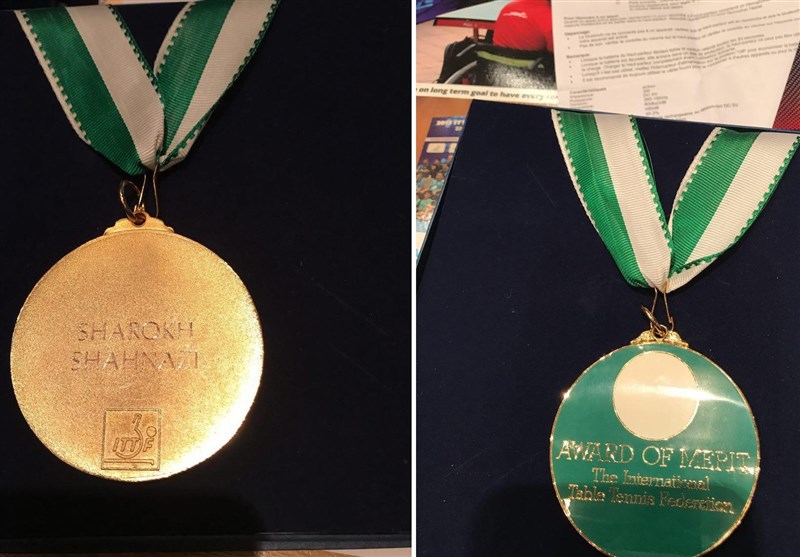 بر روی این نشان نام فدراسیون جهانی تنیس روی میز و در پشت آن نام شاهرخ شهنازی حک شده است.