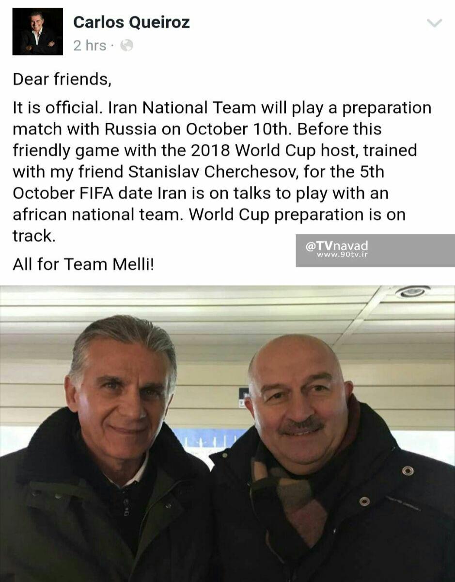 به گزارش جی پلاس، کی‌روش با انتشار عکسی همراه با سرمربی روسیه اعلام کرد دیدار تدارکاتی دو تیم ۱۰ اکتبر(۱۸مهر) امسال برگزار می شود.
