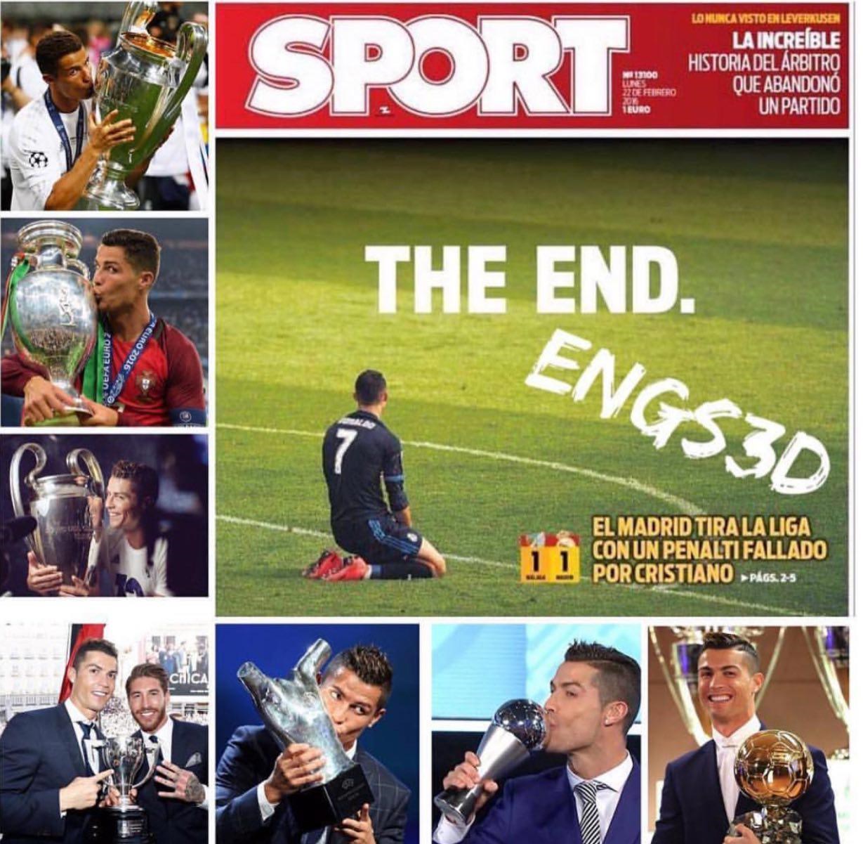 سال گذشته روزنامه اسپورت که یکی از روزنامه های هوادار بارسلونا است به دنبال یکی از نمایش های ضعیف این ستاره پرتغالی در ترکیب رئال مادرید تیتر زد: «پایان». منظور این روزنامه از چنین تیتری این بود که رونالدو دیگر ستاره سابق نخواهد شد و کم کم به خط پایان نزدیک می شود. اما رونالدو در یک سال ثابت کرد تیتر این روزنامه توهمی بیش نبوده. او در این مدت تمام افتخارات ممکن را به دست آورد، از قهرمانی در جام ملت های اروپا گرفته تا قهرمانی در لالیگا و لیگ قهرمانان اروپا، ضمن اینکه او در این مدت افتخارات فردی متعددی را هم به دست آورده است.