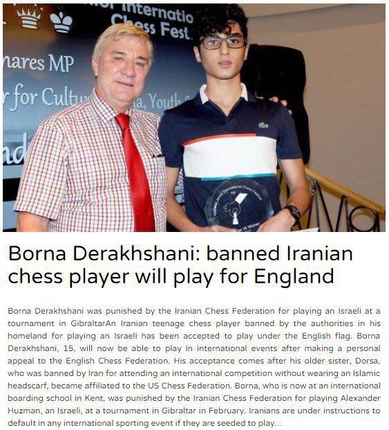 به گزارش جی پلاس، این ورزشکار پیش از این در تورنمنتی مقابل نماینده رژیم صیهونیستی به رقابت پرداخت به همین دلیل از حضور در ایران منع شد. به همین دلیل وی قرار است برای تیم ملی انگلیس به میدان برود. برنامه درخشانی که 15 سال دارد می‌تواند در رقابت‌های بین‌المللی شطرنج با پرچم انگلیس به میدان برود.