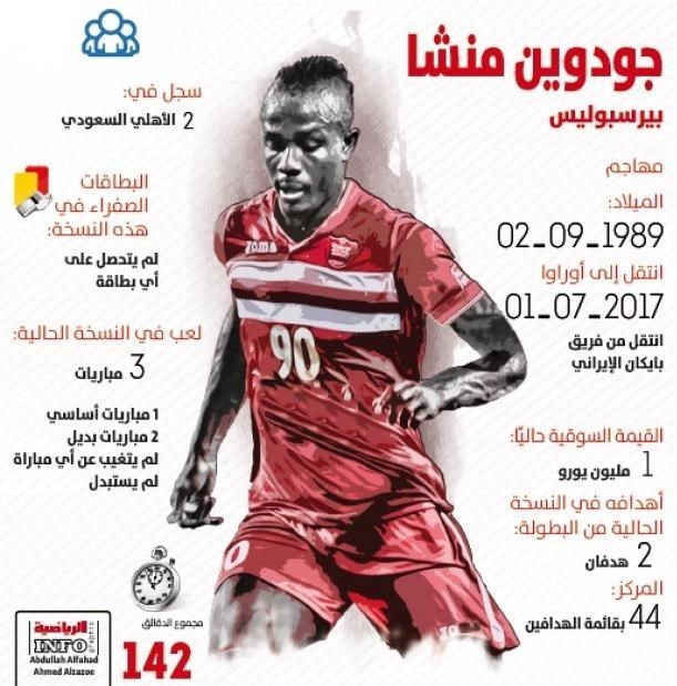 این رسانه عربستانی در خبری دیگری با انتشار اینوگرافی از گادوین منشا، مهاجم نیجریهای پرسپولیس که شامل عملکرد فنی او در این تیم بوده، آورده است: گادوین منشا نجاتدهنده جدید پرسپولیس پس از ضربه دردناک فیفا به پرسپولیس با محرومیت مهدی طارمی در پرونده شکایت باشگاه ریزه اسپور ترکیه است. منشا توانست تاثیرگذار ظاهر شود و با گلزنی در دیدار با الاهلی در یکچهارم نهایی لیگ قهرمانان آسیا باعث صعود پرسپولیس شود. او تاکید کرده با وجود دریافت 4 گل در بازی رفت برابر الهلال برای بازی برگشت روز سهشنبه در عمان پا پس نخواهند کشید.
