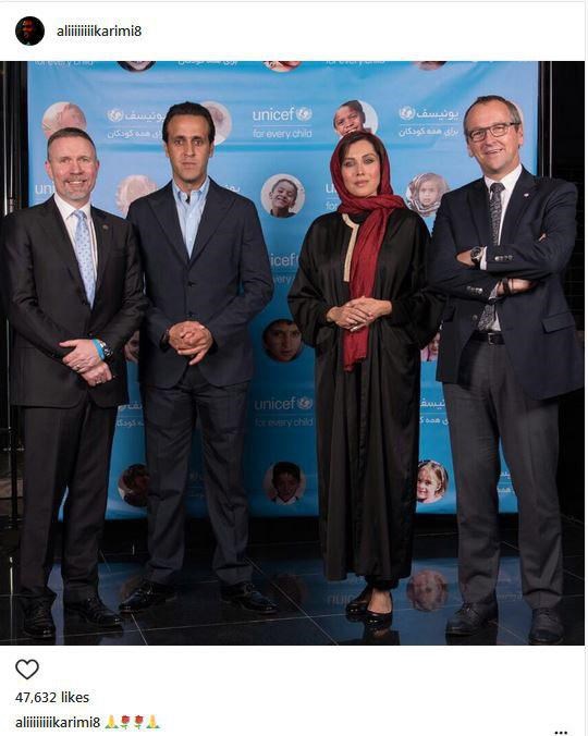 به گزارش جی پلاس، این عکس به فعالیت های علی کریمی در یونیسف مربوط می شود. گویا او رسما نماینده این نهاد شده است. کریمی عکسی را در کنار مهتاب کرامتی از خود منتشر کرد.
