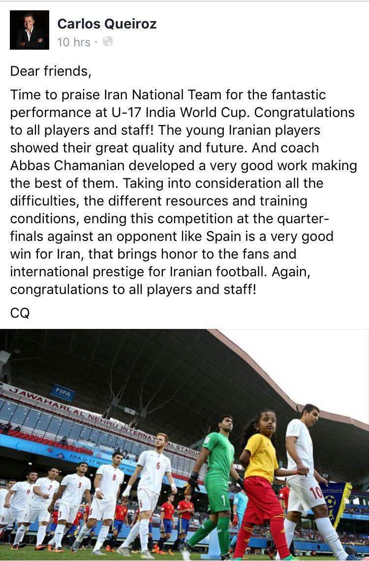 اکنون زمان آن است که تیم ملی زیر هفده سال را به خاطر نمایش فوق العاده شان مورد ستایش قرار دهیم، تبریک به تمام بازیکنان و اعضای کادرفنی، بازیکنان جوان ایرانی کیفیت و آینده بی نظیرخودشان را نشان دادند. و سرمربی این تیم عباس چمنیان با کار بی نظیر خود باعث این اتفاق و پیشرفتشان شد. با درنظر گرفتن تمام سختی ها، منابع و شرایط و تمرین های متفاوت، شکست در برابر تیمی مثل اسپانیا در مرحله یک چهارم نهایی برای تیم ایران پیروزی محسوب میشود و باعث افتخار هواداران وکسب پرستیژ بین المللی برای فوتبال ایران است.