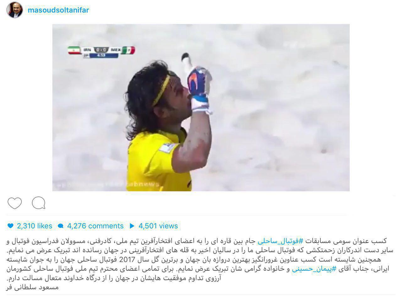 مسعود سلطانی فر وزیر ورزش و جوانان، کسب عنوان سومی مسابقات فوتبال ساحلی جام بین قارهای جهان را تبریک گفت.