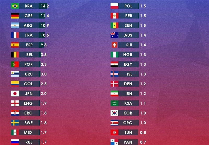 از نگاه اوپتا، برزیل با 14.2، آلمان با 11.4 و آرژانتین با 10.9 شانسهای اول تا سوم قهرمانی نام دارند.