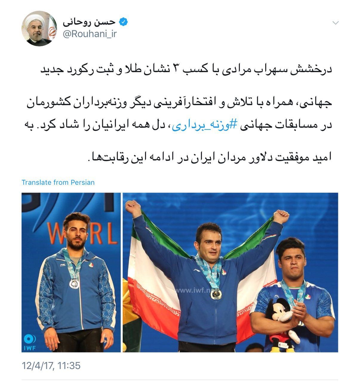 دکتر روحانى در پیام توییترى قهرمانى سهراب مرادى را در مسابقات جهانى تبریک گفت.