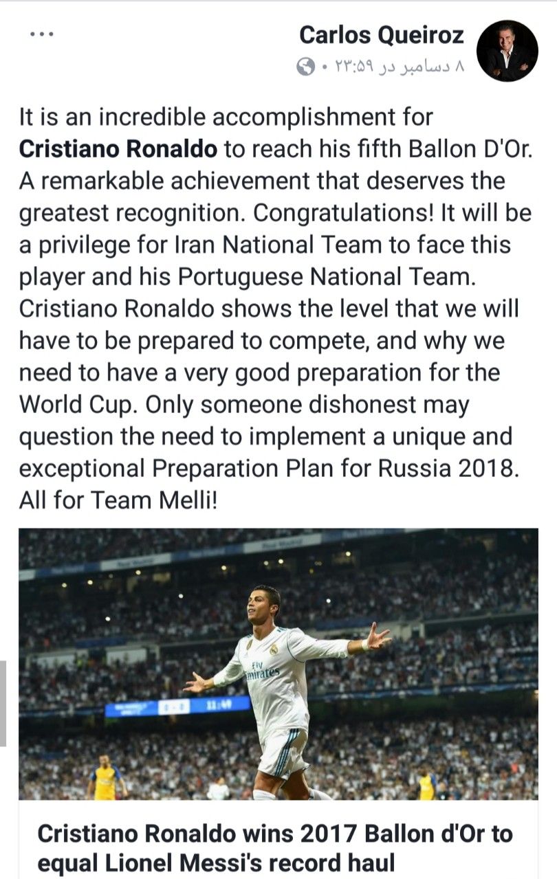 سرمربی پرتغالی تیم ملی ایران درباره دریافت پنجمین توپ طلای رونالدو در صفحه مجازی خود نوشت: انتخاب رونالدو به عنوان مرد سال فوتبال دنیا سطحی که ما باید برای رقابت در آن آماده شویم را نشان داد.