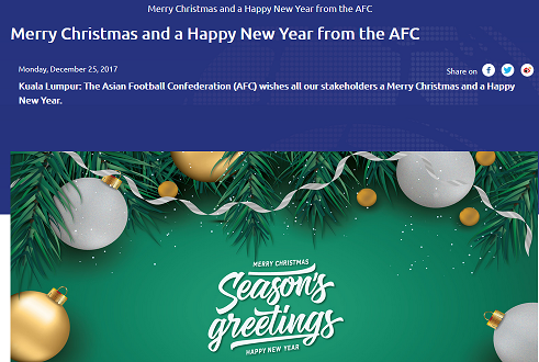 AFC در پیام تبریک کریسمس خود اعلام کرد: فوتبال آسیا یکی دیگر از سال های پر بار را پشت سر گذاشت. موفقیت باورنکردنی بعضی تیم ها و درخشش بی نظیر بازیکنان ،حاصل رقابت های این قاره بود که جهانیان را جذب کرد.