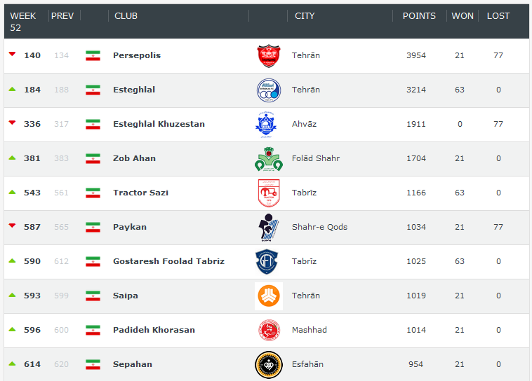 استقلال صاحب ۳۲۱۴ امتیاز شد و از رده ۱۸۸ به ۱۸۴ رسید. استقلال خوزستان نیز دچار سقوط شد. این تیم اهوازی ۱۹۱۱ امتیاز گرفت و از رده ۳۱۷ به ۳۳۶ تنزل جایگاه پیدا کرد.