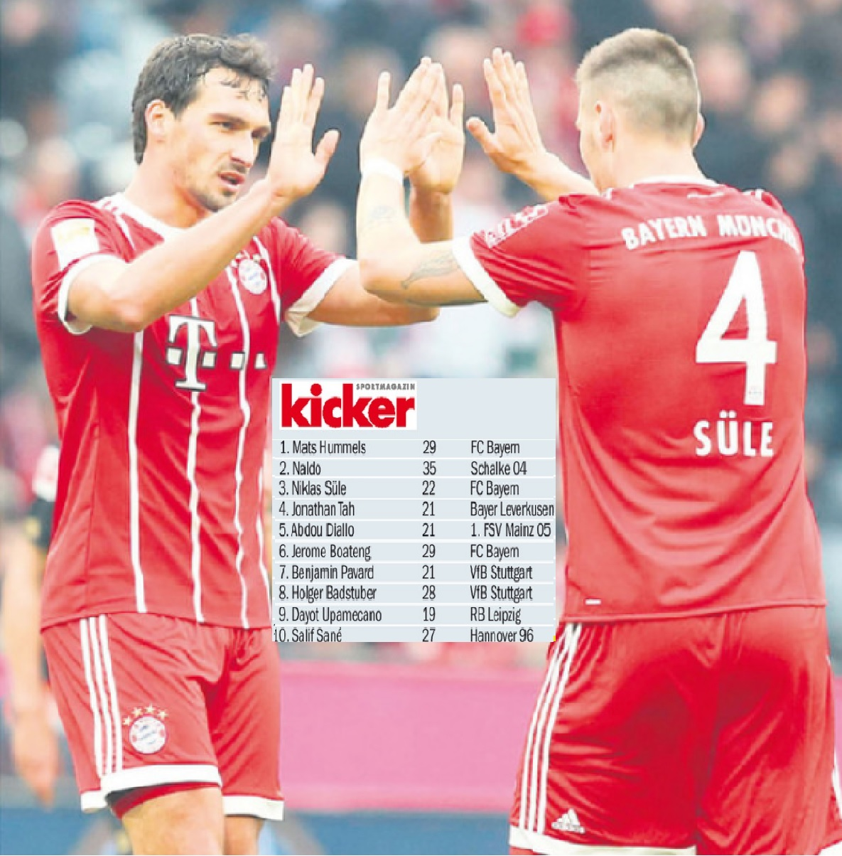 جاناتان تاه (بایرلورکوزن)، عبدو دیالو(ماینتس)، جروم بواتنگ(بایرن مونیخ)،بنیامین پافارد(اشتوتگارت)، هولگر باداشتوبر(اشتوتگارت)،دایو اوپامکانو(آر.ب لایپزیگ)، و سالیف سانه(هانوفر) در ردههای چهارم تا دهم ایستادند.