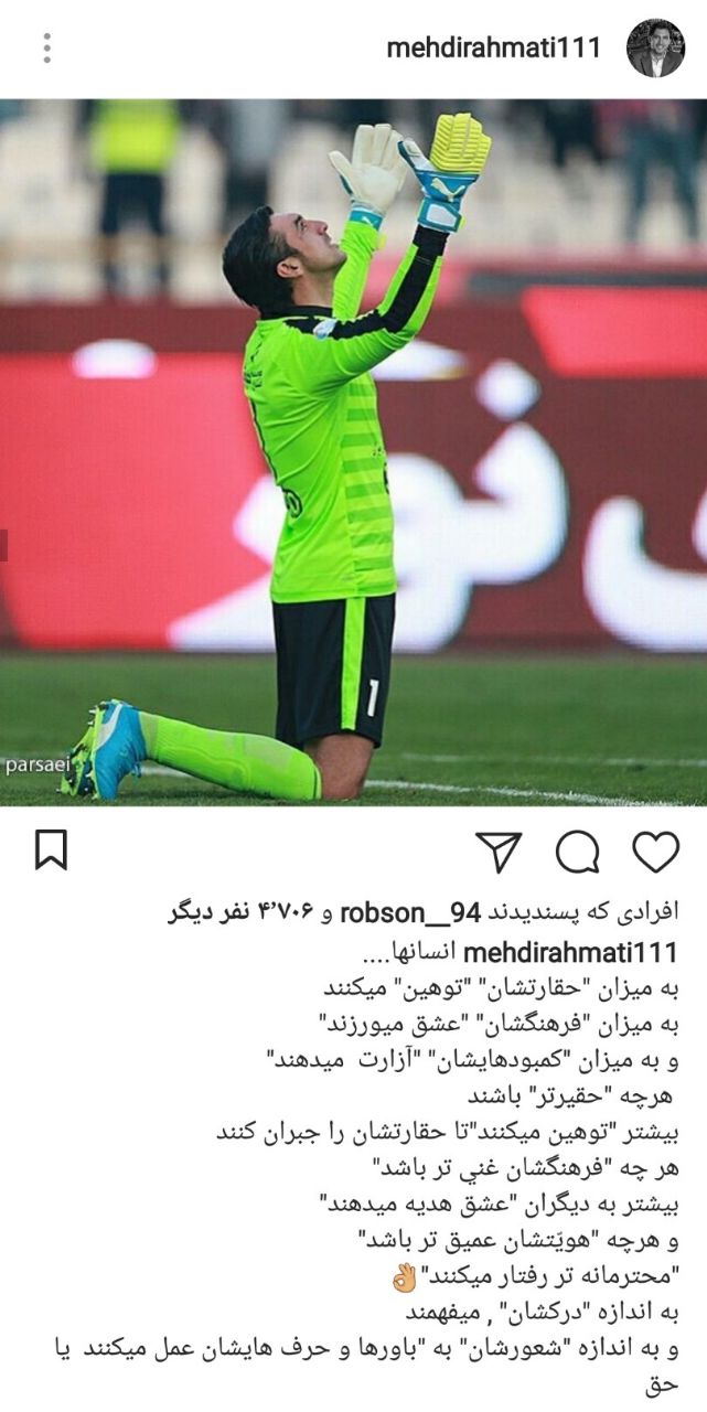 به گزارش جی پلاس، مهدی رحمتی دروازه بان تیم استقلال با انتشار مطلبی در صفحه شخصی خود نسبت به کسانی که از او انتقاد می کنند واکنش نشان داد و خبرساز شد.