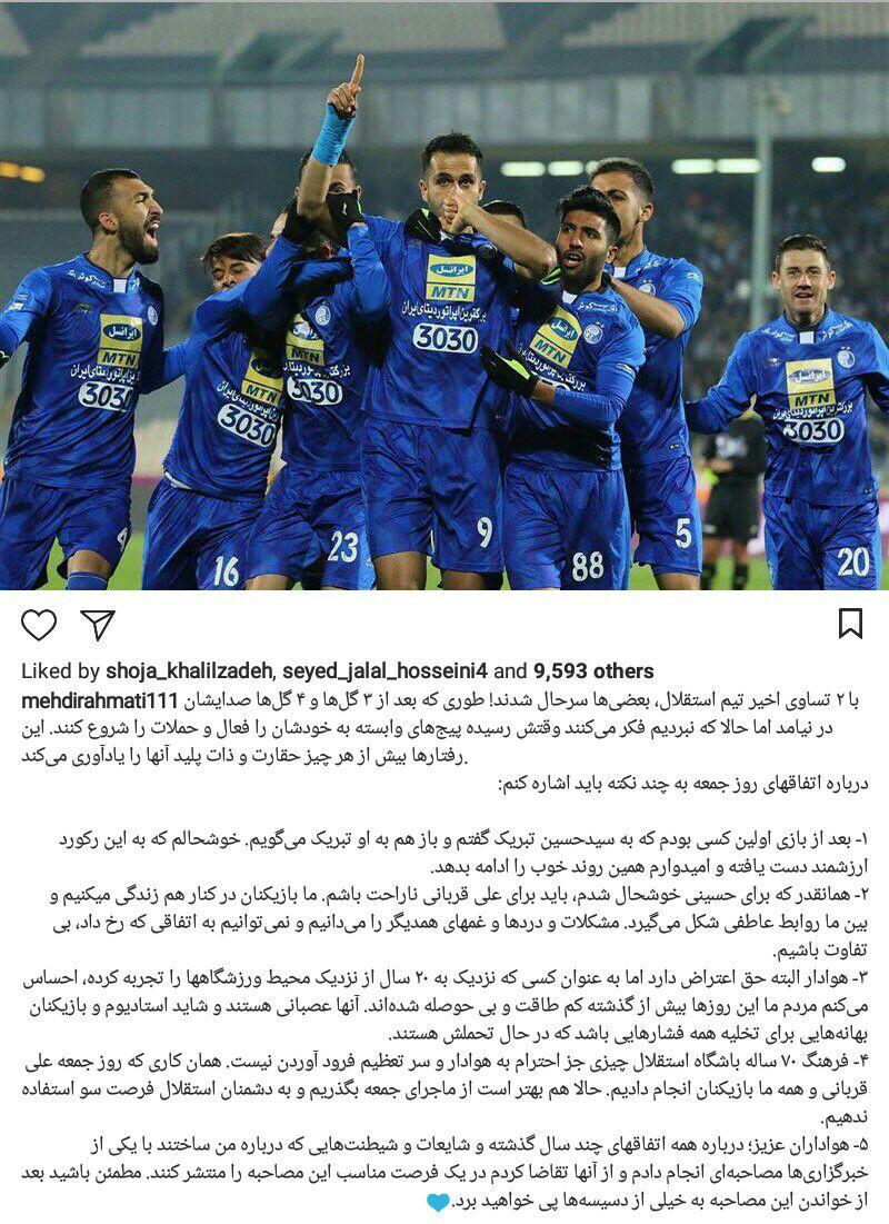 وی در این پست نوشت: با ۲ تساوی اخیر تیم استقلال، بعضیها سرحال شدند! طوری که بعد از ۳ گلها و ۴ گلها صدایشان در نیامد اما حالا که نبردیم فکر میکنند وقتش رسیده پیجهای وابسته به خودشان را فعال و حملات را شروع کنند. این رفتارها بیش از هر چیز حقارت و ذات پلید آنها را یادآوری میکند.