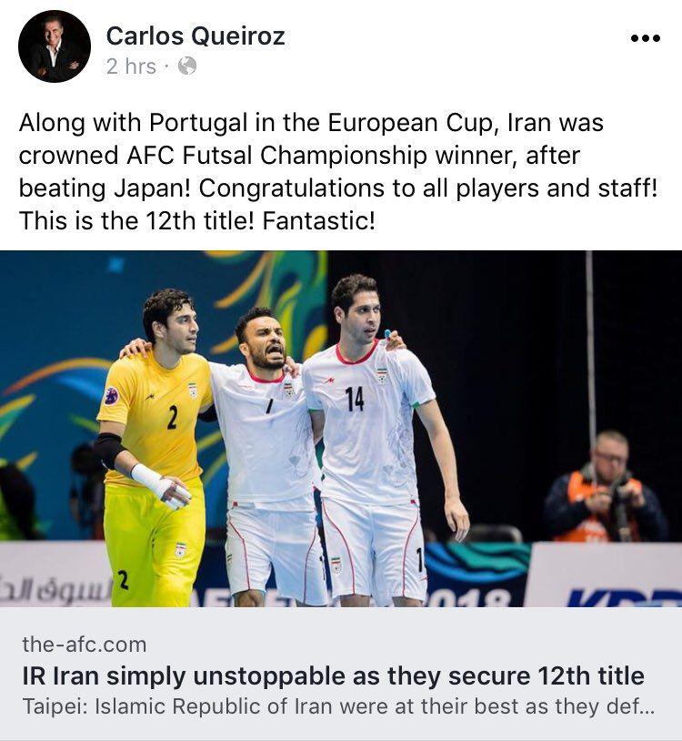 به گزارش جی پلاس، سرمربی تیم ملی فوتبال ، کارلوس کیروش با انتشار پیامی در صفحه فیس بوکش گفت: همراه با قهرمانی پرتغال در رقابتهای فوتسال قهرمانی اروپا، تیم ایران هم با شکست ژاپن قهرمان آسیا شد. تبریک به همه بازیکنان و کادر! این دوازدهمین قهرمانی است! فوقالعاده است!