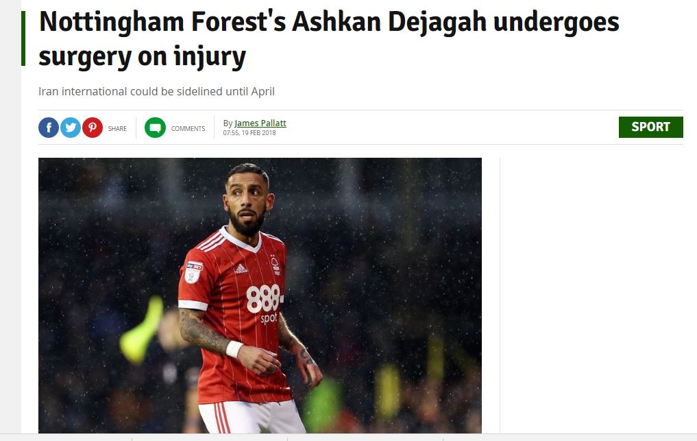 به گزاش جی پلاس، سایت ناتینگهام پست خبر داد که باشگاه ناتینگهام فارست قرار است درمان اشکان دژاگه، بازیکن ایرانی خود را به خاطر مصدومیتش از ناحیه زانو زیر نظر داشته باشد و تحت عمل جراحی قرار دهد. این بدان معناست که اشکان به مدت ۲ ماه از میادین دور خواهد بود.