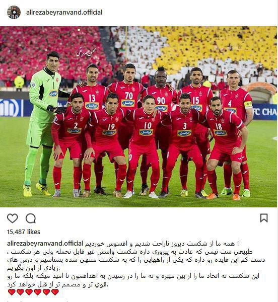 به گزارش جی پلاس، دروازه بان پرسپولیس ، علیرضا بیرانوند با ارسال پستی در صفحه اینستاگرامخود نسبت به باخت روز گذشته پرسپولیس مقابل السد واکنش نشان داد.