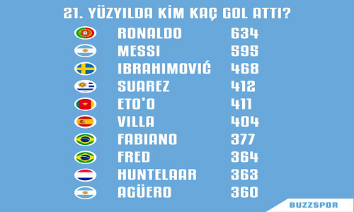 نام ستارههایی همچون رونالدو پرتغالی، لیونل مسی آرژانتینی و زلاتان سوئدی در لیست گلزنان برتر قرن ۲۱ وجود دارد.