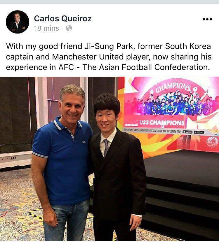 به گزارش جی پلاس، کارلوس کی روش پست جدیدی در صفحه فیس بوکش ارسال کرد و نوشت:" با دوست خوبم پارک جی سونگ، بازیکن سابق تیم ملی کرهجنوبی و منچستریونایتد که حالا تجربیاتش را در AFC به اشتراک میگذارد."