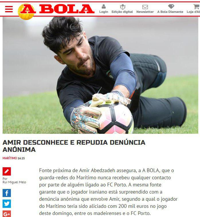 به گزارش سرویس ورزشی جی پلاس، روزنامه اِبولا، پُر تیراژترین روزنامه ورزشی پرتغال امروز در مطلبی خبر داد که بنا بر شکایتنامه ای که به صورت ناشناس به دادگستری پرتغال واصل شده  باشگاه پورتو با امیر عابدزاده، دروازه‌بان ایرانی تیم ماریتیمو ارتباط برقرار کرده تا با پرداخت مبلغ ۲۰۰ هزار یورو، او در بازی آینده دو تیم که یکشنبه شب هفته آینده در چارچوب هفته سی و دوم لیگ برتر پرتغال برگزار می‌شود، بازی خوبی انجام ندهد؛ این خبر عجیب در حالی منتشر شده که استناد به یک شکایت‌نامه ناشناس در حساس‌ترین روزهای فوتبال پرتغال برای انتشار یک گزارش جنجالی حرفه‌ای به نظر نمی‌رسد و بی‌دلیل نیست که کی‌روش در توصیف وضع از کلمه لجن‌زار استفاده کرده است.