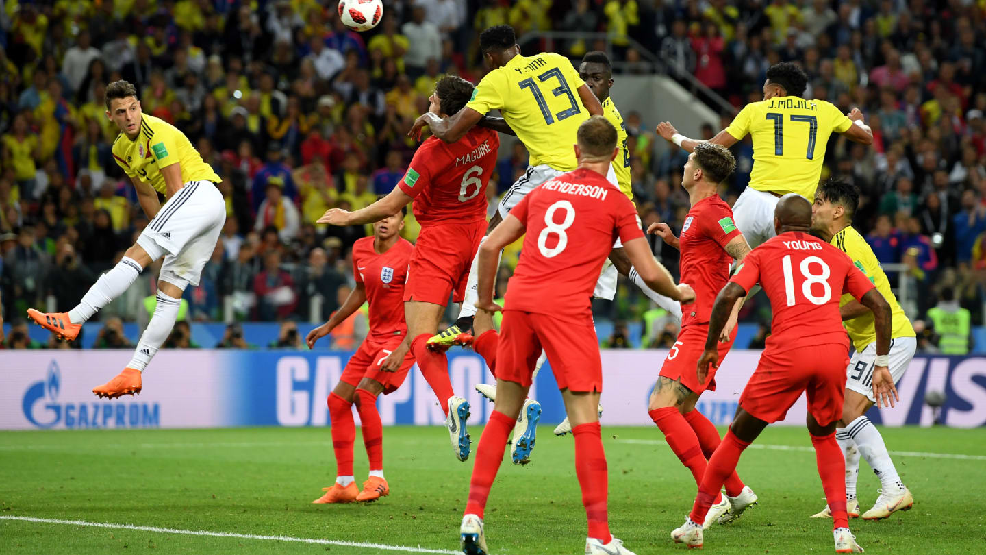 یری مینا هم در دقیقه 93 گل تساوی تیمش را زد و به دومین بازیکن تاریخ کلمبیا بعد از خامس رودریگز تبدیل شد که در یک دوره جام جهانی 3 گل یا بیشتر می زند. گل مینا برابر انگلیس سومین گل این مدافع بود. نکته جالب این است که هر سه گل این بازیکن با ضربه سر زده شد. کلوزه بازیکن تیم ملی آلمان در سال 2002 توانسته بود پنج گل را با ضربه سر بزند.