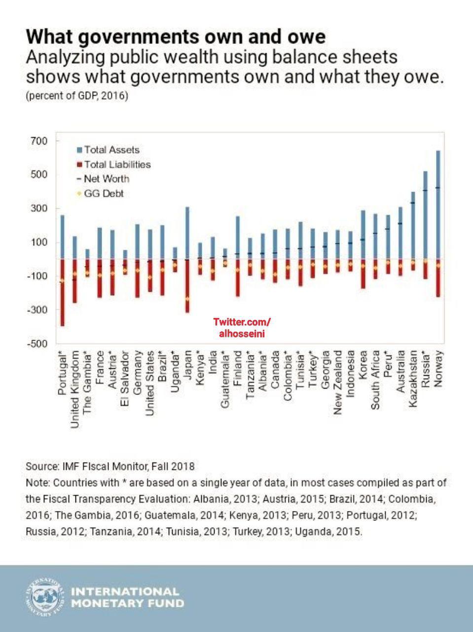 «مقایسه دارایی و بدهی دولتها: دولت ایران با ۷۰۰۰هزار میلیارد تومان دارایی احصا شده (تخمین ۱۵۰۰۰هزارمیلیارد تومان کل داراییها) و بین ۲۰۰ تا ۶۰۰ هزار میلیارد تومان بدهی در بدترین حالت با ۶۴۰۰ هزارمیلیارد تومان خالص ثروت که برابر ۴۰۰ درصد GDP میشود کنار نروژ قرار میگیرد.