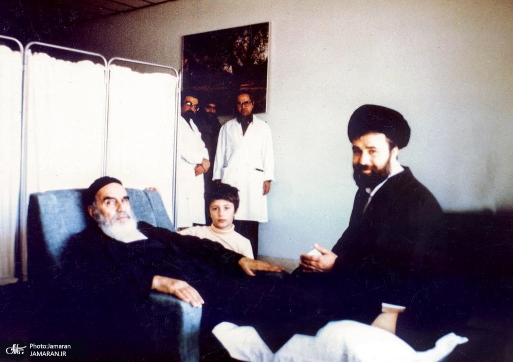 سید احمد و سید حسن خمینى در کنار امام دیده مى شوند. دکتر حسن عارفى در انتهاى تصویر ایستاده است.