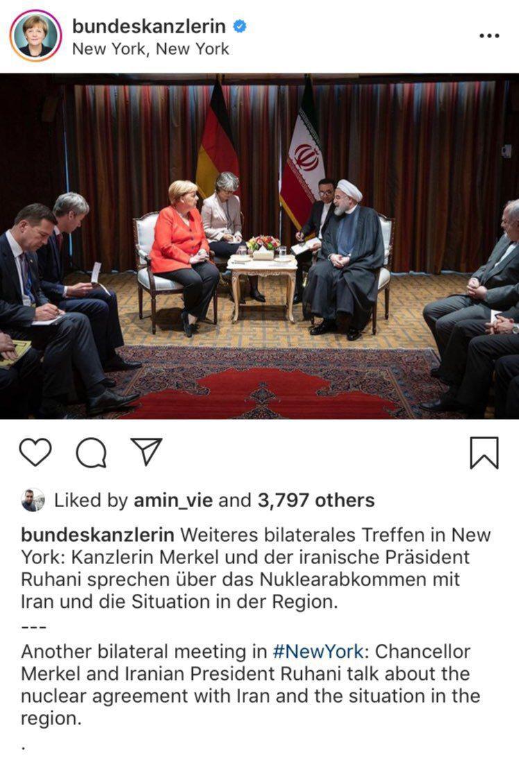 به گزارش جماران؛ در صفحه اینستاگرام صدراعظم آلمان آمده است: «یک دیدار دوجانبه دیگر در نیویورک: صدراعظم مرکل با رئیس جمهور ایران روحانی در مورد توافق هسته ای و اوضاع منطقه صحبت کردند.»