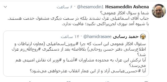 به گزارش جماران، حسام الدین آشنا در پاسخ به حمید رسایی نماینده سابق تهران در مجلس که اتهاماتی درباره پرویز اسماعیلی معاون پیشین ارتباطات دفتر نهاد ریاست جمهوری مطرح کرده بود نوشت: