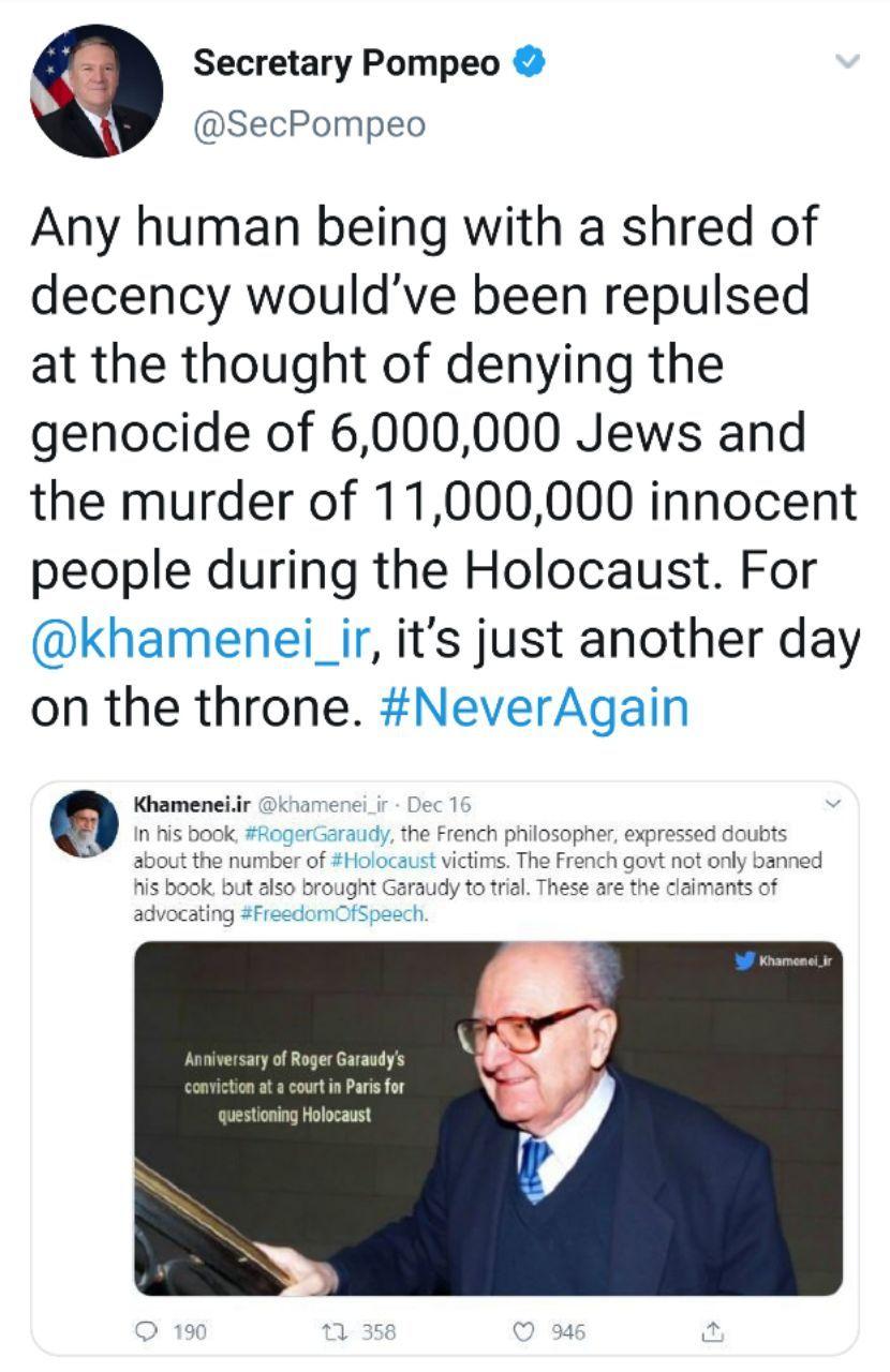 به گزارش جماران؛ وزیر خارجه آمریکا از اشاره رهبر انقلاب به شوخی بودن آزادی بیان در کشورهای غربی و زندانی کردن نویسندگان به خاطر تشکیک در مورد تعداد قربانیان هولوکاست به خشم آمد.