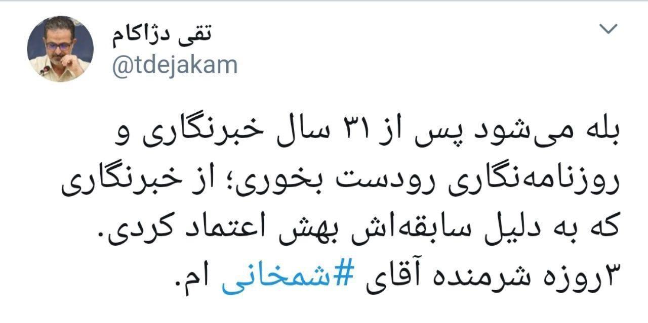 «بله می شود پس از ۳۱ سال خبرنگاری و روزنامه نگاری رودست بخوری؛ از خبرنگاری که به دلیل سابقه اش بهش اعتماد کردی. سه روزه شرمنده آقای #شمخانی ام.»