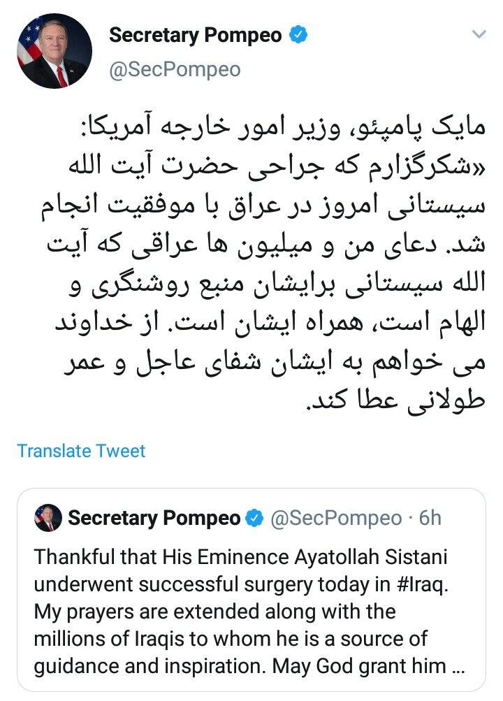 «اگر کسی خواست در آینده کتابی در باره برکت های خون ⁧حاج قاسم⁩ بنویسد یادش نرود ورود زبان فارسی به کاخ سفید را هم اضافه  کند.⁧ پمپئو⁩ حتی برای عراق هم توئیت فارسی می نویسد.»