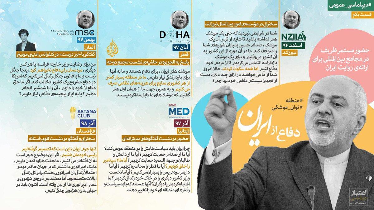 «برآمدن ‎ترامپ پیامدهای بسیار داشت اما یک گزاره را نیز ثابت کرد: ‎ظریف، دیپلماتی  برای همه‌ی هنگامه‌های ایران است. او همانقدر که طراح توافق و بانی ‎صلح است، در صف اول دفاع از قدرت بازدارندگی ایران نیز ایستاده. او مدافع تمام‌وقت منافع مردم ایران است چه در صلح و چه در ‎تحریم.»