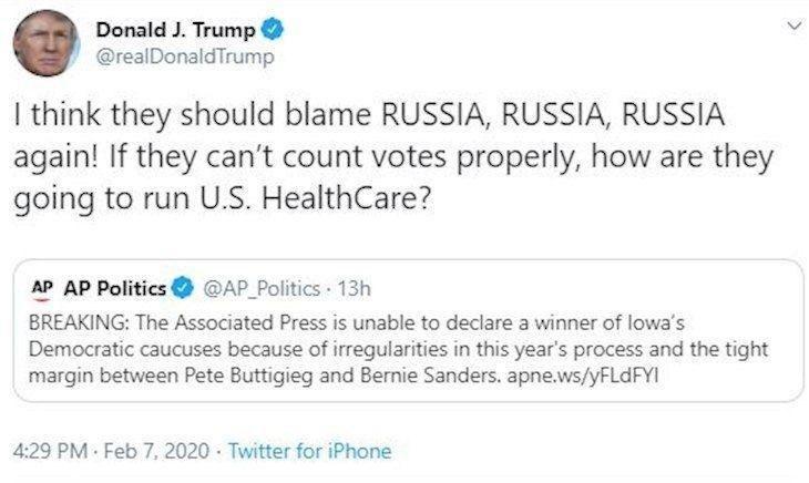 «فکر کنم آنها باید دوباره روسیه، روسیه و روسیه را سرزنش کنند! اگر آنها نمیتوانند آرا را درست بشمارند، چگونه قرار است آمریکا یا خدمات درمانی را اداره کنند؟»