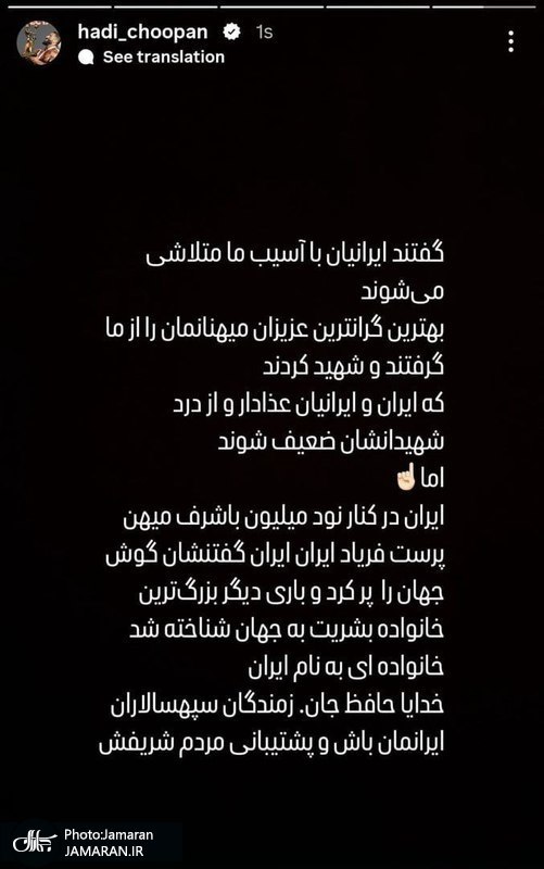 به گزارش جماران، هادی چوپان با ارسال یک سلسله استوری اینستاگرامی در حمایت از ایران برابر حمله رژیم صهیونیستی، نوشت: «بمیرم ندهم تن به غیر وطن»