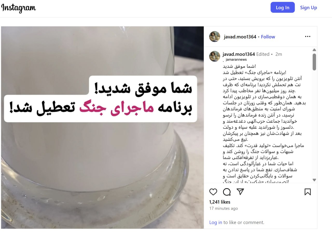 به گزارش جماران؛ جواد موگویی مجری برنامه ماجرای جنگ که به تهیه‌کنندگی «حوزه هنری» دو قسمت از آن تاکنون در تلویزیون و فضای مجازی پخش شده، امشب در صفحه اینستاگرام خود نوشت:
