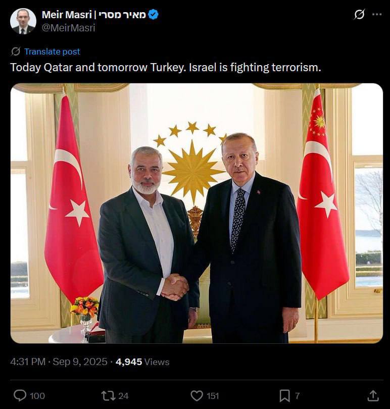 به گزارش جماران؛ «مئیر مصری»، روزنامهنگار و استاد دانشگاه صهیونیست نوشت: «امروز قطر و فردا ترکیه. اسرائیل در حال مبارزه با تروریسم است»