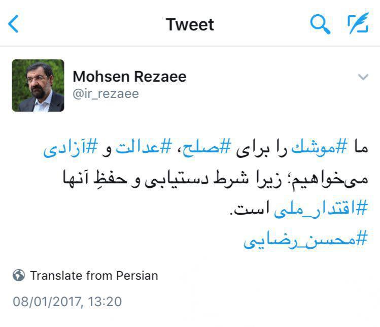 به گزارش جماران، محسن رضایی در توئیتر خود نوشت: ما موشک را برای صلح، عدالت و آزادی میخواهیم؛ زیرا شرط دستیابی و حفظِ آنها اقتدار ملی است.