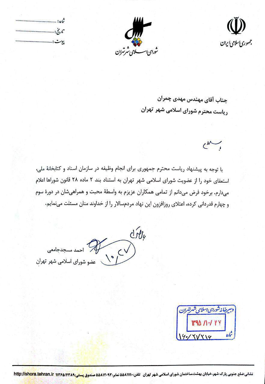 احمد مسجدجامعی از عضویت شورای شهر تهران استعفا داد.