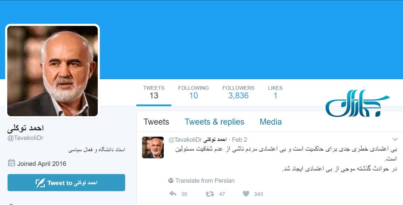به گزارش جماران، احمد توکلی در صفحه توئیتر خود نوشت: "بی اعتمادی خطری جدی برای حاکمیت است و بی اعتمادی مردم ناشی از عدم شفافیت مسئولین است. در حوادث گذشته موجی از بی اعتمادی ایجاد شد."