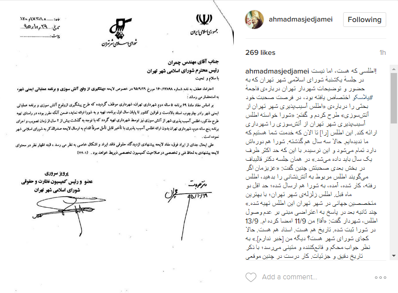 چند ثانیه بعد در پاسخ به اعتراضی مبنی بر عدم وصول اطلس، شهردار گفت: «آقا! من 11/9 امضا کردهام. 13/9 در شورا ثبت شده. تاریخ هم هست. اسناد هم هست. حالا کجای شورای شهر هست؟ دیگه من [خبر ندارم].»