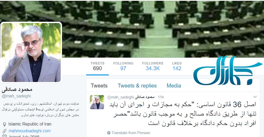 به گزارش جماران ، محمود صادقی در توئیتر خود نوشت: اصل 36 قانون اساسی: "حکم به مجازات و اجرای آن باید تنها از طریق دادگاه صالح و به موجب قانون باشد"حصر افراد بدون حکم دادگاه برخلاف قانون است"
