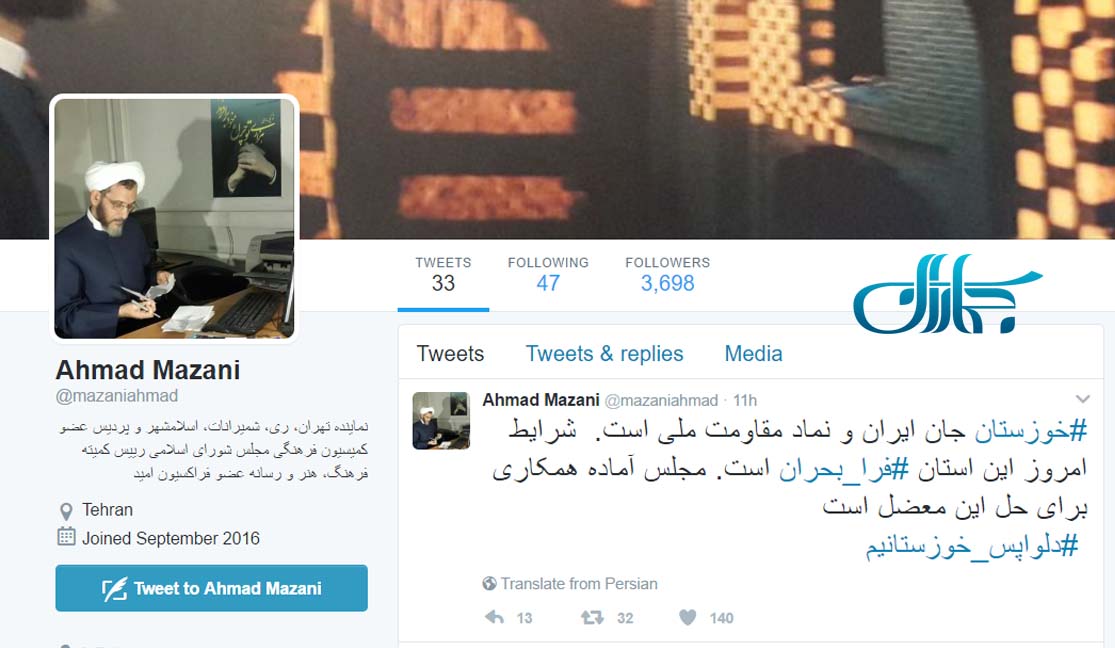 به گزارش جماران ، احمد مازنی نماینده تهران، ری، شمیرانات، اسلامشهر و پردیس در توئیتر خود نوشت: "خوزستان جان ایران و نماد مقاومت ملی است. شرایط امروز این استان فرابحران است. مجلس آماده همکاری برای حل این معضل است"