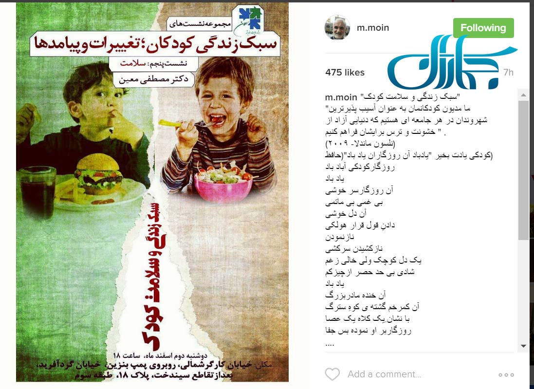 به گزارش جماران ، دکتر مصطفی معین در اینستاگرام خود نوشت: "سبک زندگی و سلامت کودک"