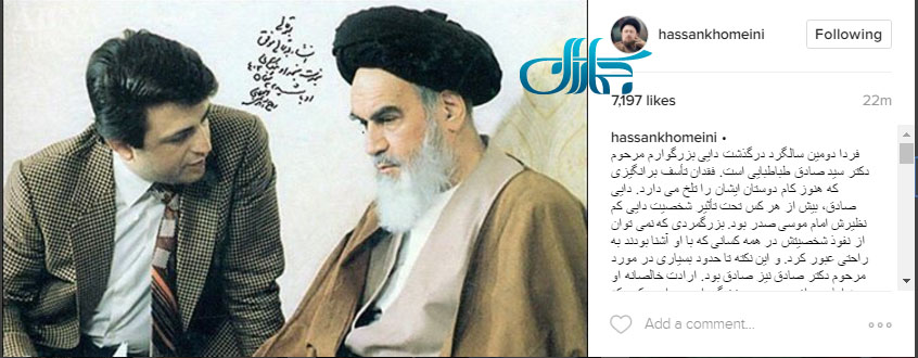 به گزارش جماران ، سیدحسن خمینی در اینستاگرام خود نوشت: " فردا دومین سالگرد درگذشت دایى بزرگوارم مرحوم دکتر سید صادق طباطبایى است. فقدان تأسف برانگیزى که هنوز کام دوستان ایشان را تلخ مى دارد. دایى صادق، بیش از هر کس تحت تأثیر شخصیت دایى کم نظیرش امام موسى صدر بود. بزرگمردى که نمى توان از نفوذ شخصیتش در همه کسانى که با او آشنا بودند به راحتى عبور کرد. و این نکته تا حدود بسیارى در مورد مرحوم دکتر صادق نیز صادق بود. ارادت خالصانه او به امام هم از وجوه معین زندگى او بود.