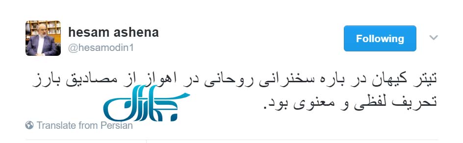 به گزارش جماران، حسام الدین آشنا در توئیتر خود نوشت: «تیتر کیهان در باره سخنرانی روحانی در اهواز از مصادیق بارز تحریف لفظی و معنوی بود.»