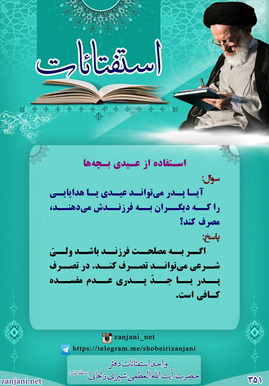 به گزارش جماران، کانال تلگرام مرجع عالیقدر تقلید آیت الله العظمی شبیری زنجانی پاسخ ایشان به یک استفتاء در مورد استفاده از عیدی بچه ها را منتشر کرد.