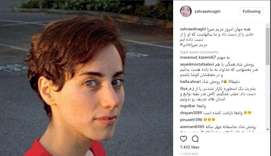 به گزارش جماران اشراقی نوشته است: «همه جهان امروز مریم میرزا خانی را از دست داد و ما سالهاست که او را از دست داده ایم».